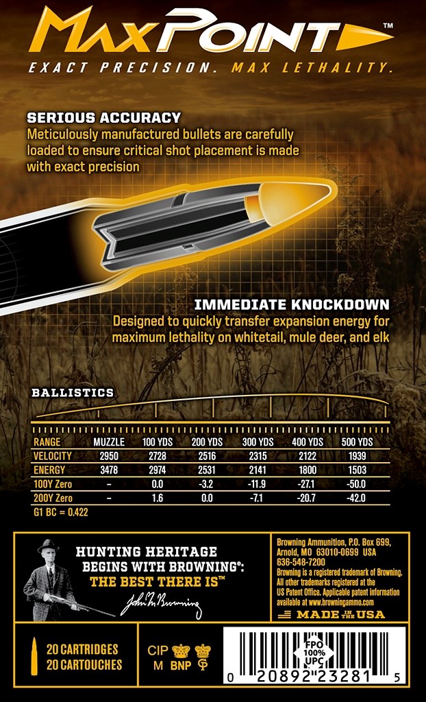 Browning® Max Point Rifle Ammunition is designed specifically for hunting medium-sized big game, including whitetail deer, mule deer, and pronghorn. Max Point bullets are meticulously manufactured, designed to quickly transfer expansion energy for maximum lethality on game. Max point: Exact Precision. Max Lethality.