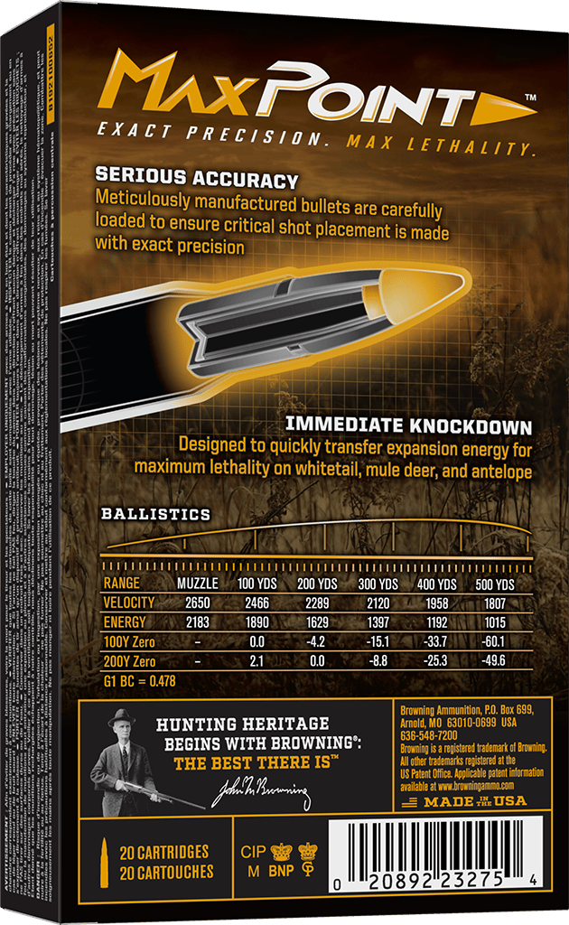 Browning® Max Point Rifle Ammunition is designed specifically for hunting medium-sized big game, including whitetail deer, mule deer, and pronghorn. Max Point bullets are meticulously manufactured, designed to quickly transfer expansion energy for maximum lethality on game. Max point: Exact Precision. Max Lethality.