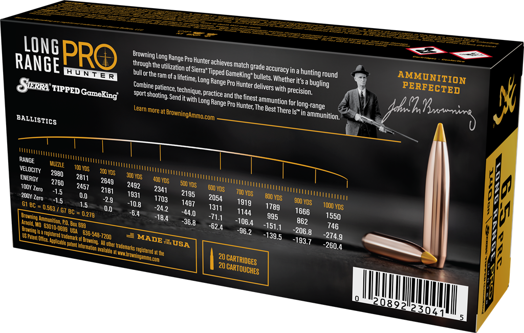 Browning Long Range Pro Hunter achieves match grade accuracy in a hunting round through the utilization of Sierra® Tipped Gameking® bullets. Whether it's a bugling bull or the ram of a lifetime, Long Range Pro Hunter delivers with precision.