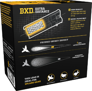 BXD Upland Extra Distance launches premium-plated shot at high velocities to achieve premium in-the-field performance. Nickel plated shot helps keep shot round resulting in high velocity retention and energy transfer as well as tighter downrange patterns.