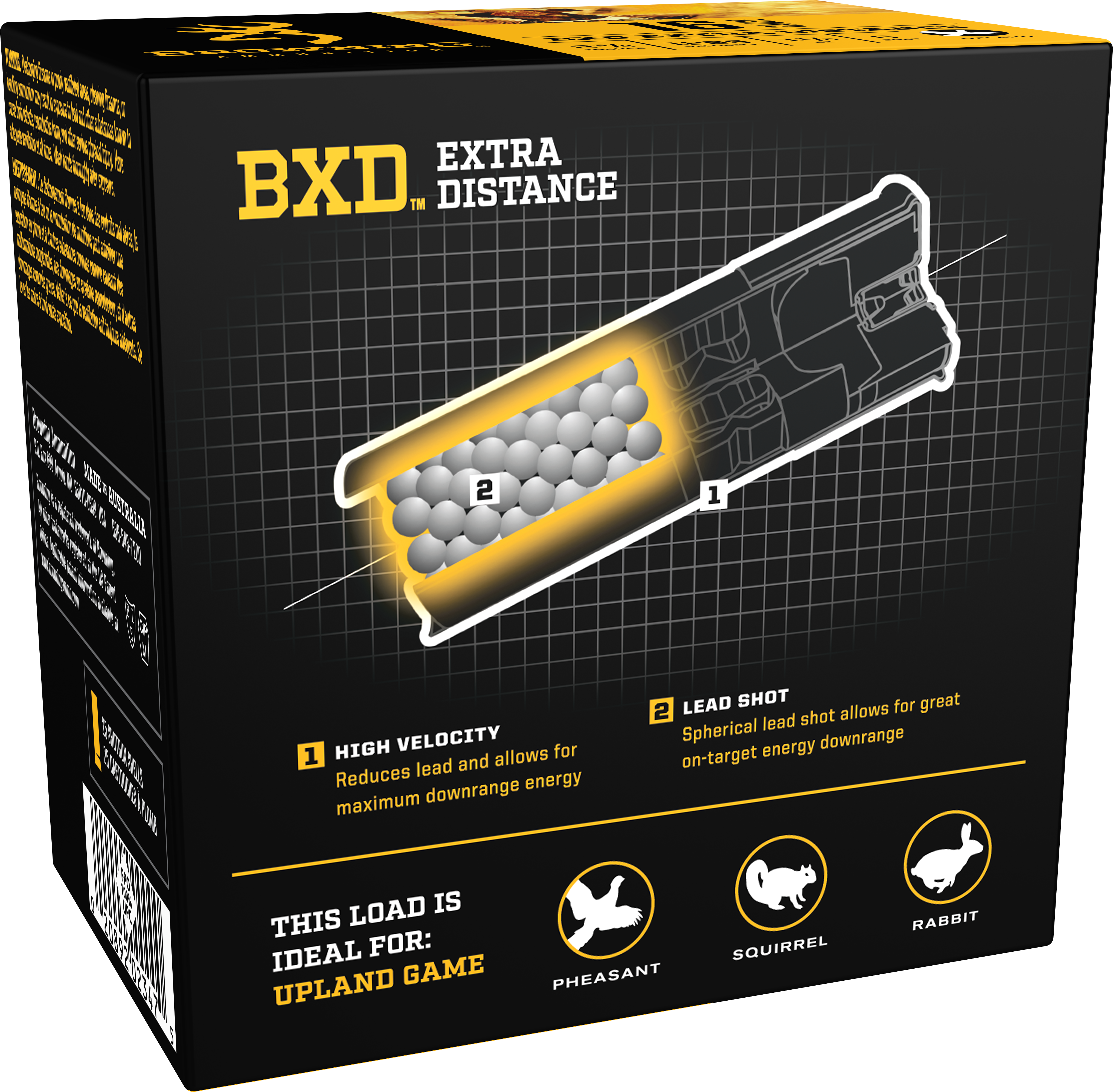 BXD Upland Extra Distance launches nickel-plated shot at high velocities to achieve premium in-the-field performance. Nickel plated shot helps keep shot round resulting in high velocity retention and energy transfer as well as tighter downrange patterns.