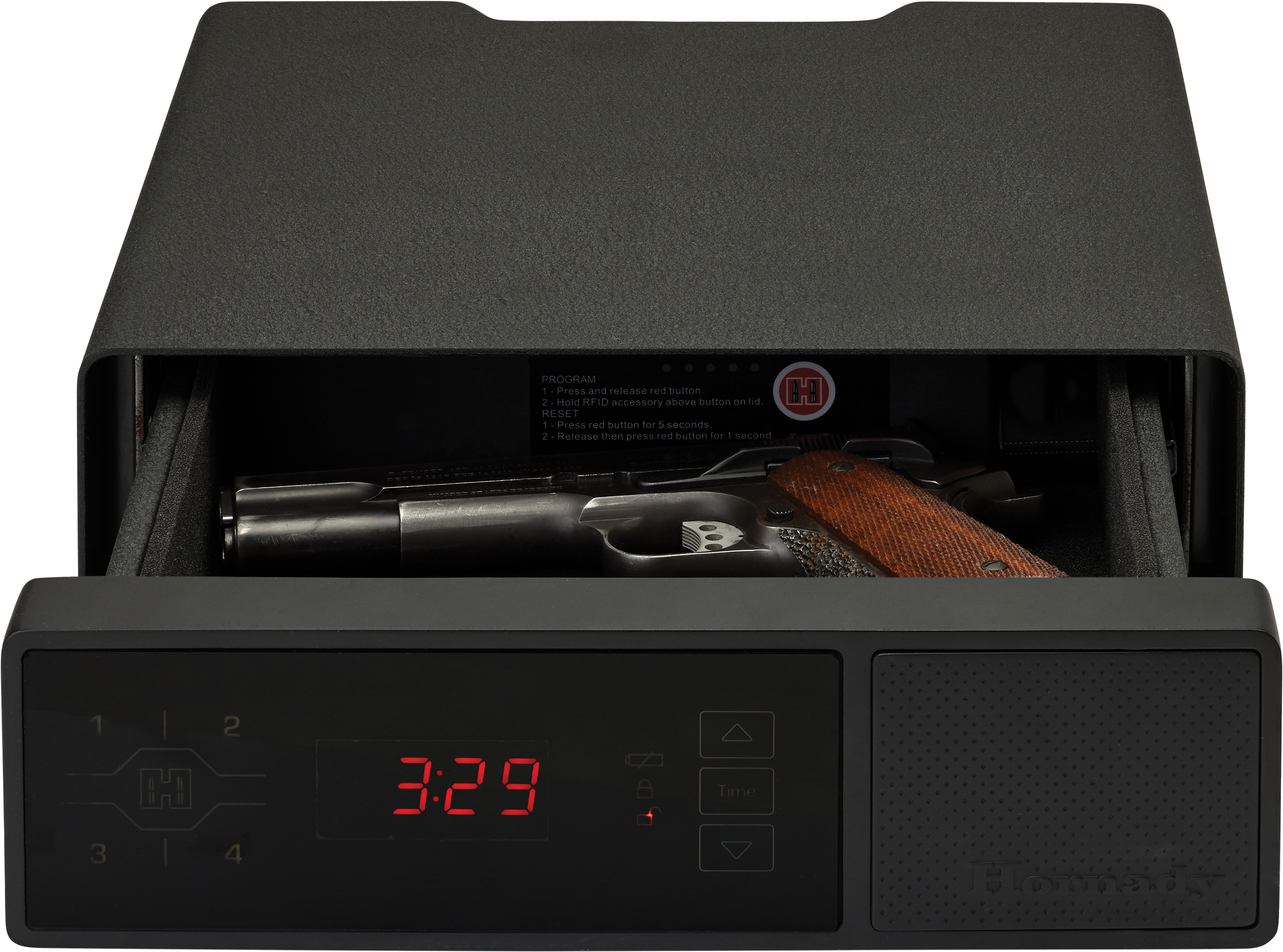 Hornady® introduces the perfect bedside companion. The RAPiD® Safe Night Guard™ keeps your handgun as close as your nightstand. RFID technology offers the quickest, most dependable access to your firearm while providing unmatched security from unauthorized users. Plus, the Night Guard™ offers the additional functionality of a clock and USB charging ports.