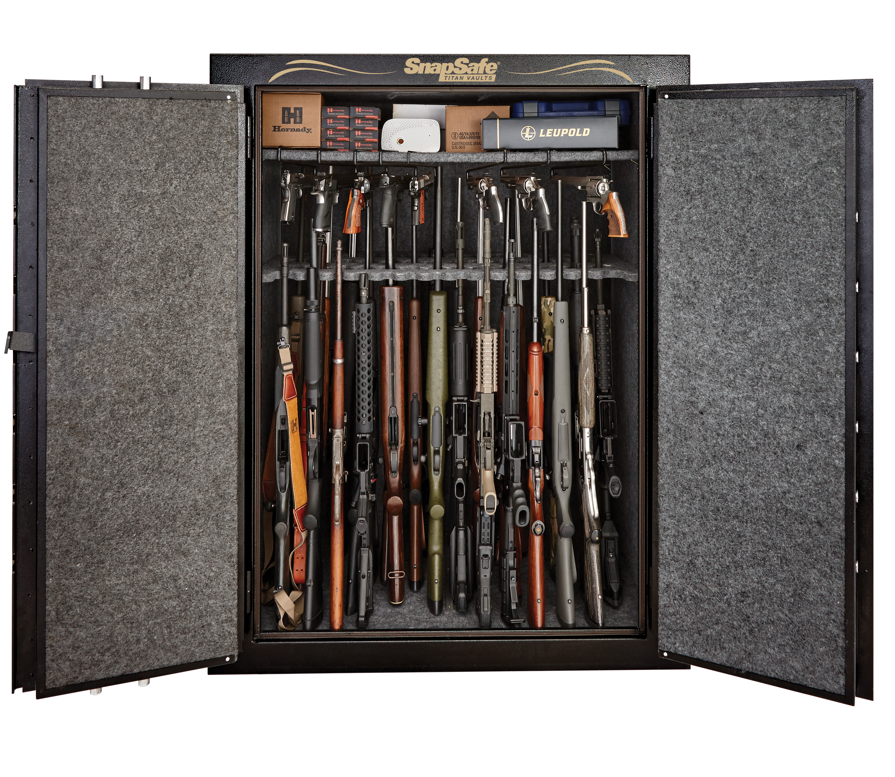 Every Super Titan ships with one full shelf and full gun rack, plus a half gun rack with two half shelves, to let you configure your vault to meet your needs. The Super Titan Double Doors feature a full gun rack. The recommended capacity is 36 long guns (XL) or 56 long guns (XXL) when stored in sleeves with the muzzles up and down, fewer if your guns have optics.